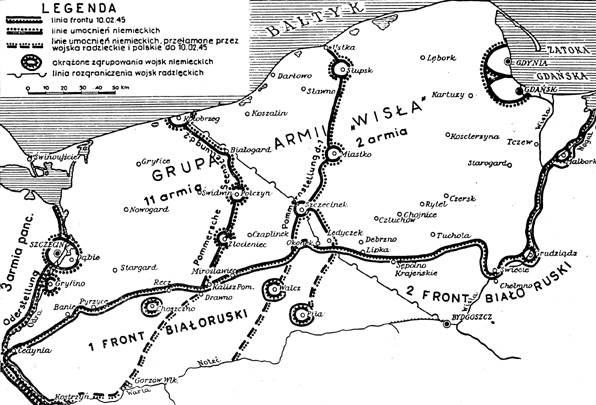 Sytuacja na froncie przed rozpoczęciem operacji pomorskiej 10.02.1945.Żródło: K. Golczewski, Wyzwolenie Pomorza Zachodniego w roku 1945, Poznań 1971, s. 105. |