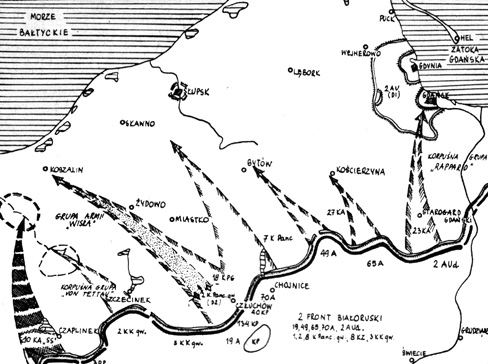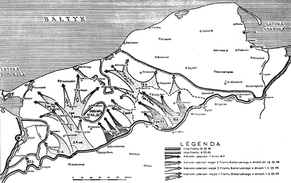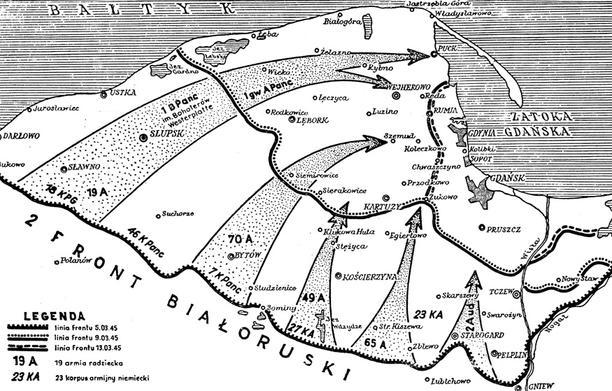 Końcowe działania Armii Czerwonej w ramach operacji pomorskiej 6-13 marca 1945. Źródło: K. Golczewski, Wyzwolenie Pomorza Zachodniego w roku 1945, Poznań 1971, s. 205. |