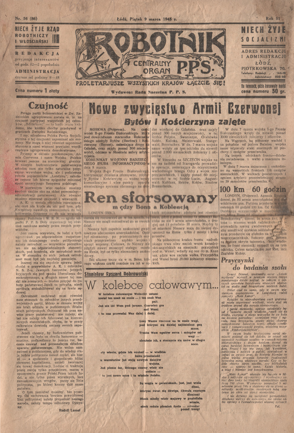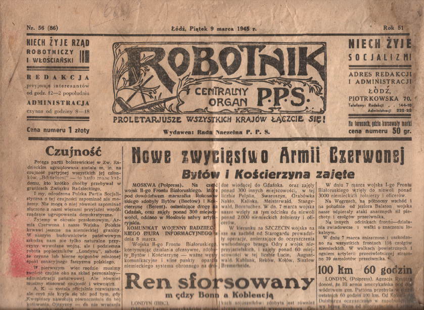 Łódzki ,,Robotnik", centralny organ PPS, 9 marca 1945 roku donosił o zajęciu Bytowa |